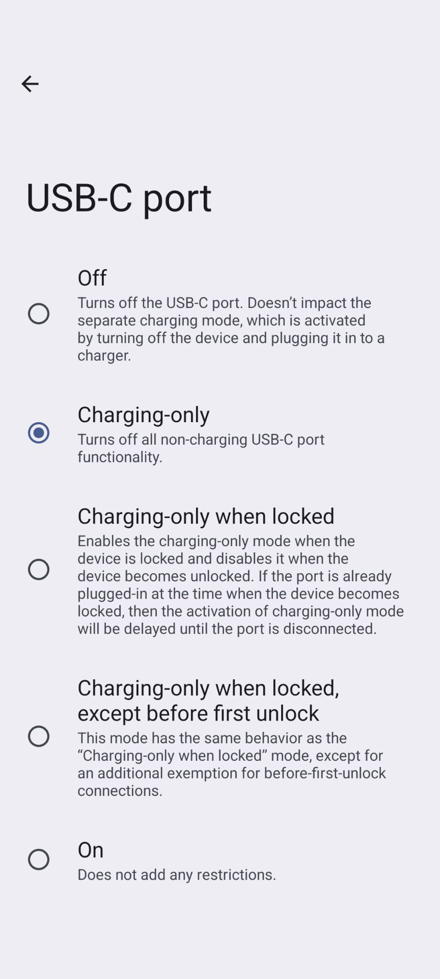不正なデータ流出を防ぐためにデフォルトで 「充電のみ」モードに設定可能です